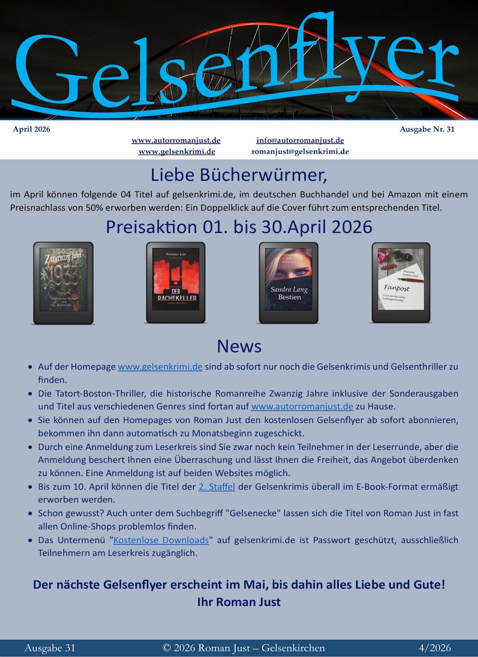 Willst du immer auf dem Laufenden bleiben über die neuesten Werke und spannenden Neuigkeiten von Autor-Selfpublisher Roman Just? Dann abonniere den Gelsenflyer! Dieser Newsletter bietet dir exklusive Einblicke, aktuelle Informationen und besondere Inhalte, die du nirgendwo anders findest. Verpasse keine Neuerscheinungen, Lesetipps und Gewinnspiele. Melde dich noch heute an und werde Teil einer wachsenden Community von Lesern, die Leidenschaft für Bücher teilen. Lass dir die Chance nicht entgehen, direkt von Roman Just zu hören und die aufregende Welt seiner Literatur mitzuerleben. Melde dich an und genieße die Vorteile des Gelsenflyers!